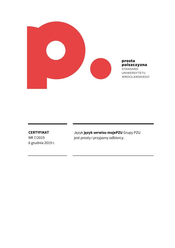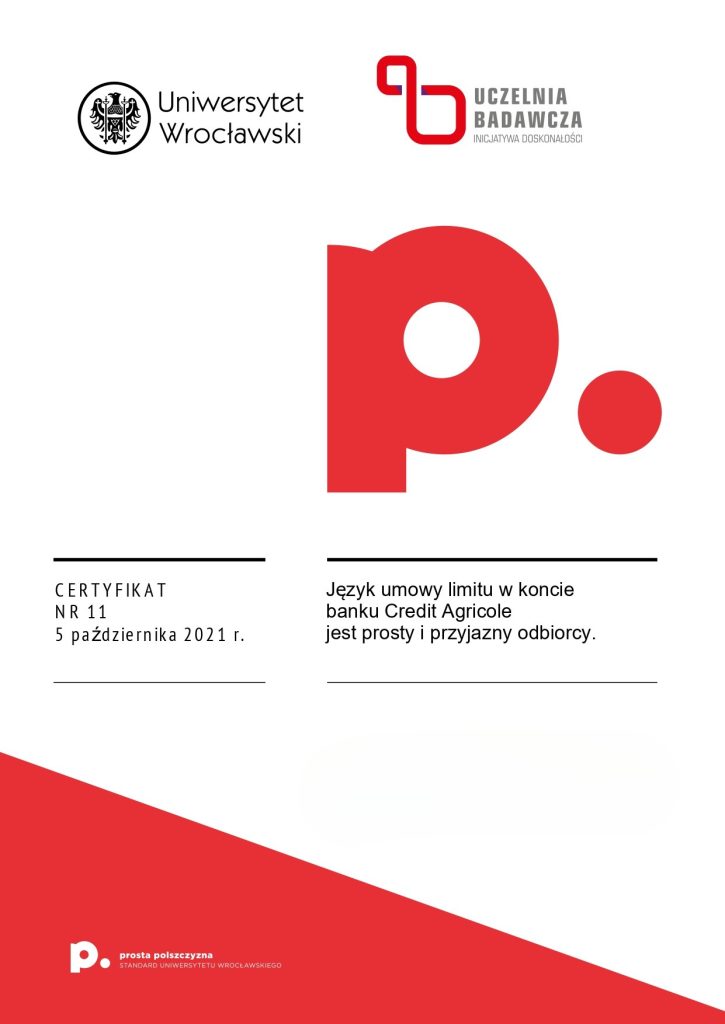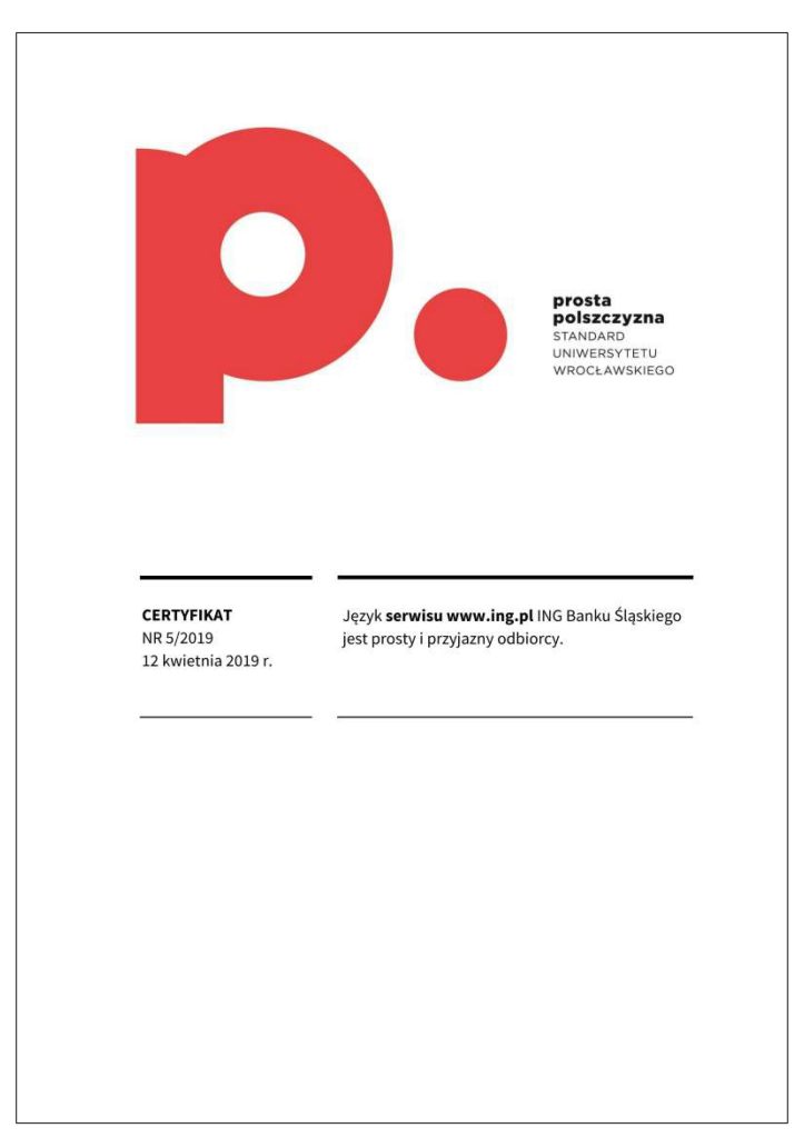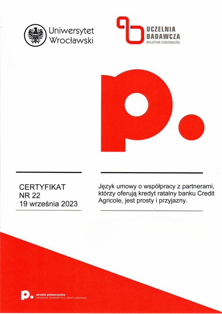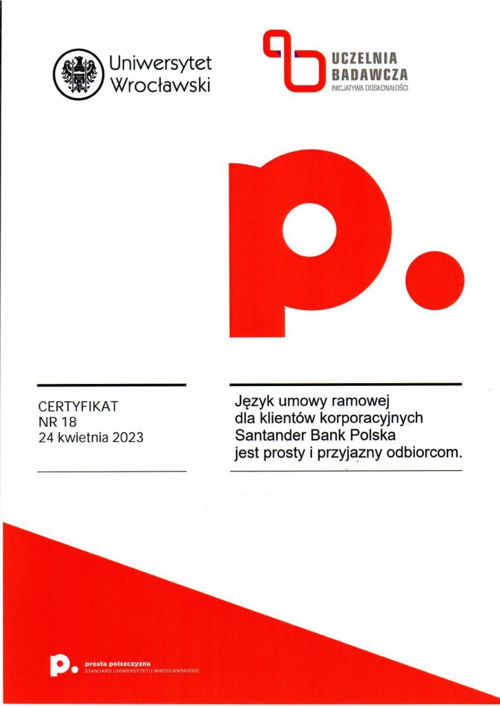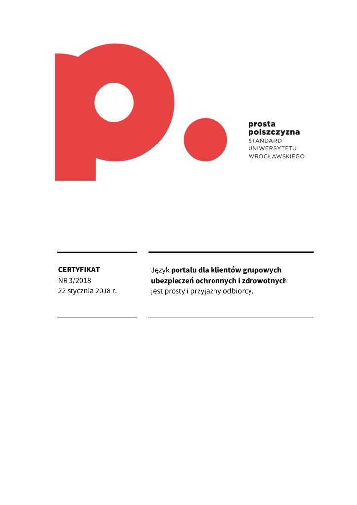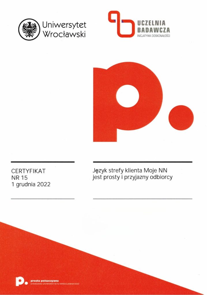Certyfikat prostej polszczyzny świadczy o tym, że dany dokument został sformułowany w taki sposób, aby być łatwo zrozumiałym dla różnych grup odbiorców, eliminując niepotrzebnie skomplikowane sformułowania czy trudne do zrozumienia terminy. Korzyści z posiadania certyfikatu dokumentu za używanie prostego języka polskiego mogą obejmować poprawę relacji z odbiorcami, zminimalizowanie ryzyka błędów interpretacyjnych, a także zwiększenie ogólnej przejrzystości i akceptowalności dokumentu wśród różnych grup społecznych. Certyfikat taki może także świadczyć o zaangażowaniu organizacji w komunikację opartą na prostym języku, co może wpływać pozytywnie na jej wizerunek. Certyfikat ten może być umieszczony na pierwszej stronie dokumentu lub dostarczony osobno. Napisz do nas: wspolpraca.ppp@uwr.edu.pl