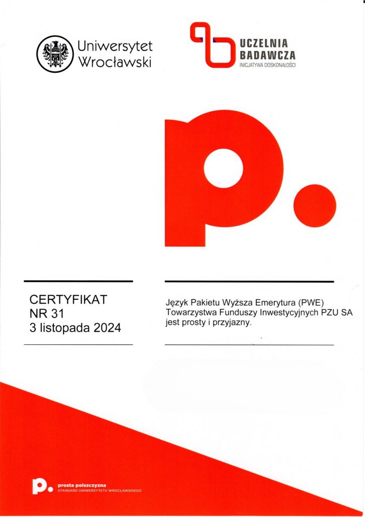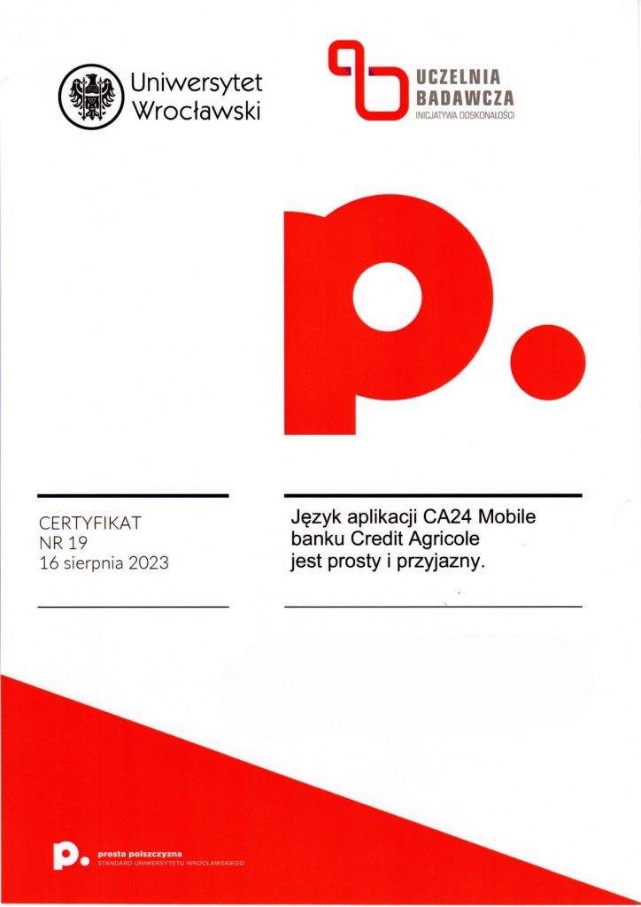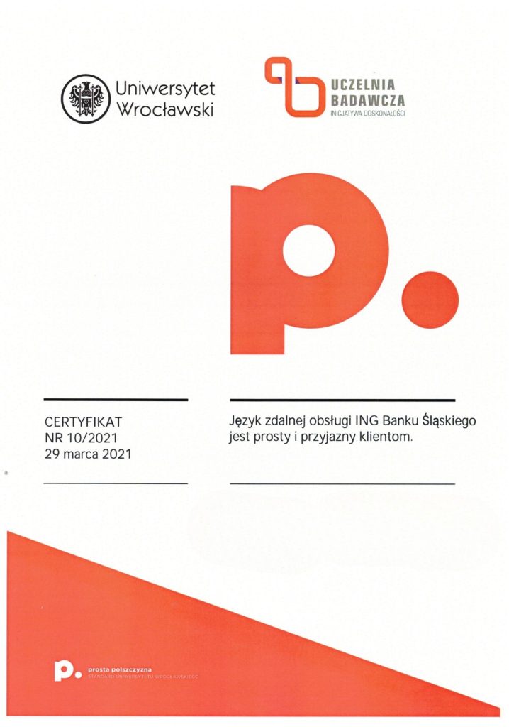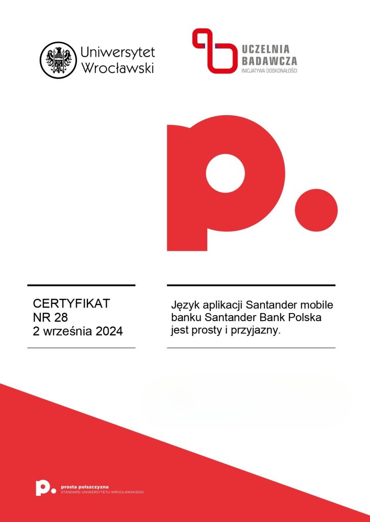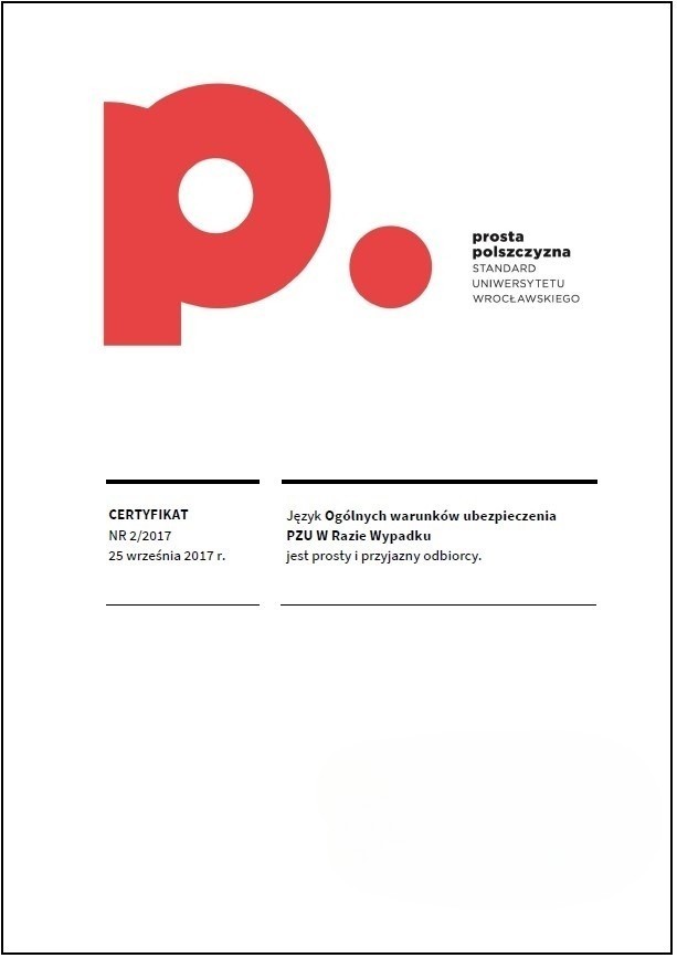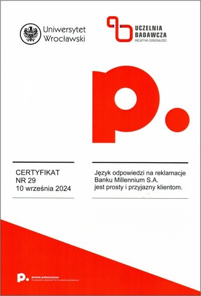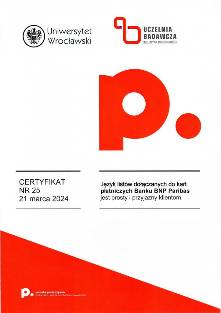 Certyfikat prostej polszczyzny świadczy o tym, że dany dokument został sformułowany w taki sposób, aby być łatwo zrozumiałym dla różnych grup odbiorców, eliminując niepotrzebnie skomplikowane sformułowania czy trudne do zrozumienia terminy. Korzyści z posiadania certyfikatu dokumentu za używanie prostego języka polskiego mogą obejmować poprawę relacji z odbiorcami, zminimalizowanie ryzyka błędów interpretacyjnych, a także zwiększenie ogólnej przejrzystości i akceptowalności dokumentu wśród różnych grup społecznych. Certyfikat taki może także świadczyć o zaangażowaniu organizacji w komunikację opartą na prostym języku, co może wpływać pozytywnie na jej wizerunek. Certyfikat ten może być umieszczony na pierwszej stronie dokumentu lub dostarczony osobno. Napisz do nas: wspolpraca.ppp@uwr.edu.pl