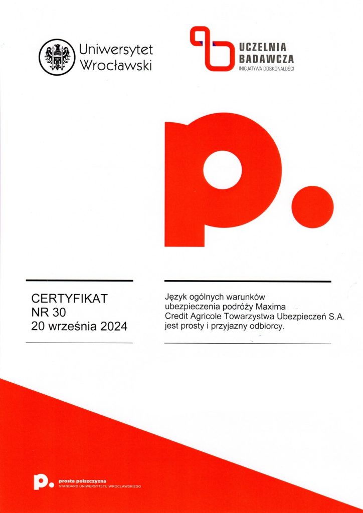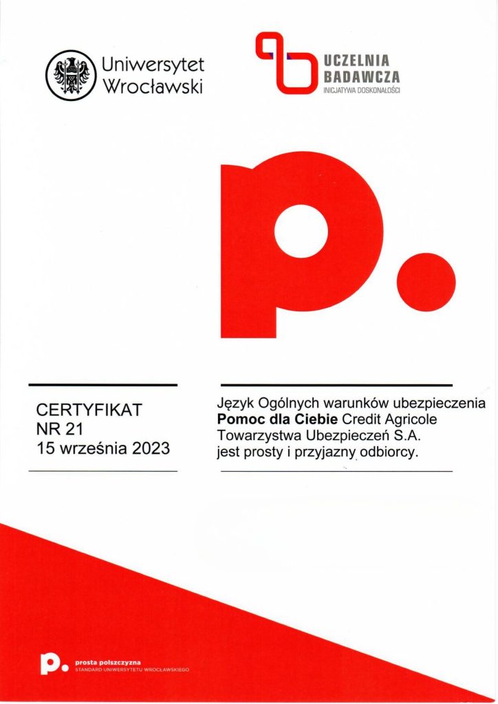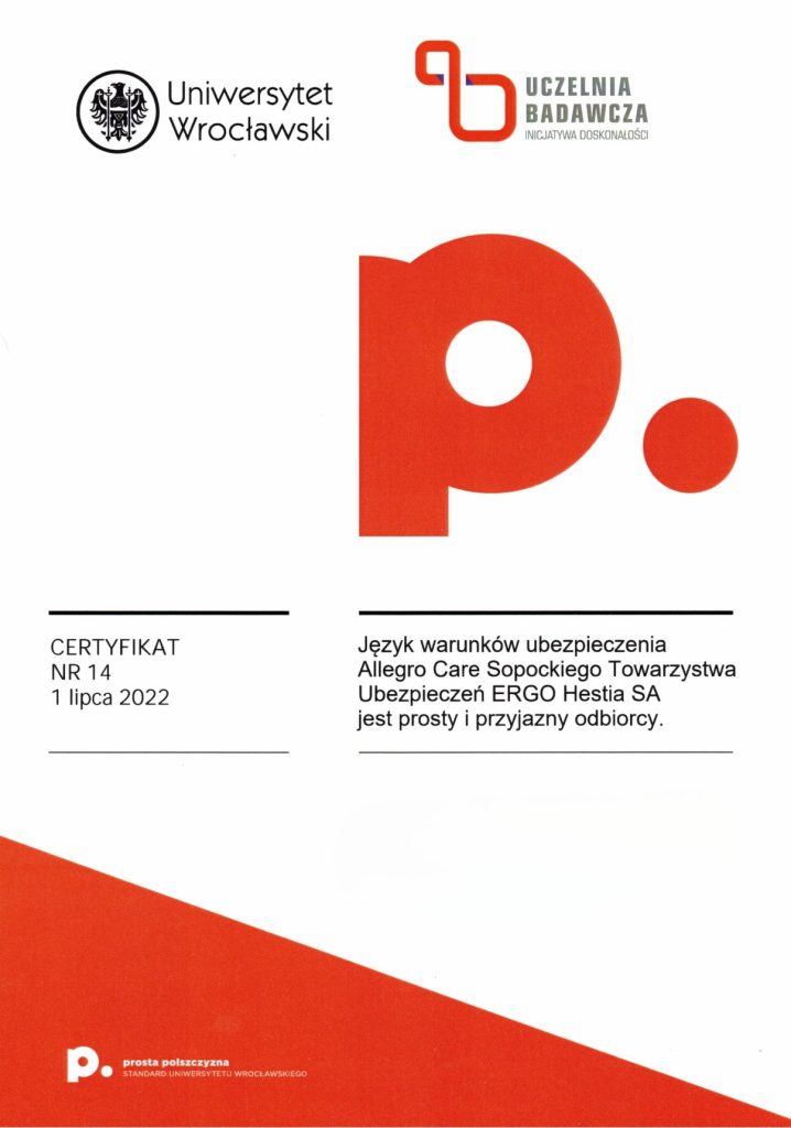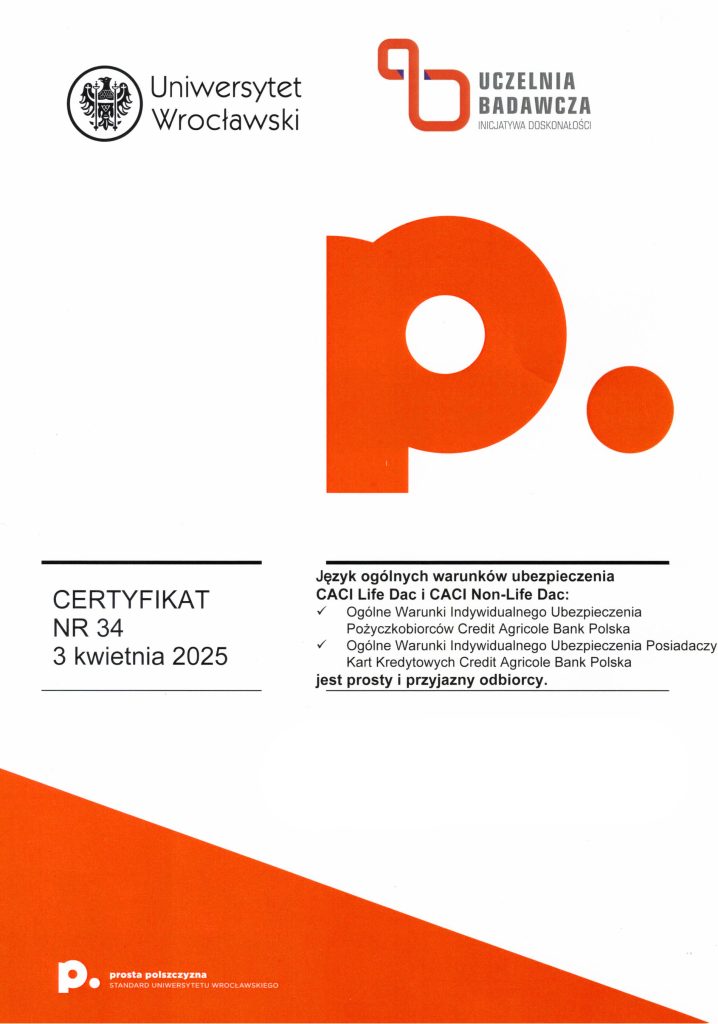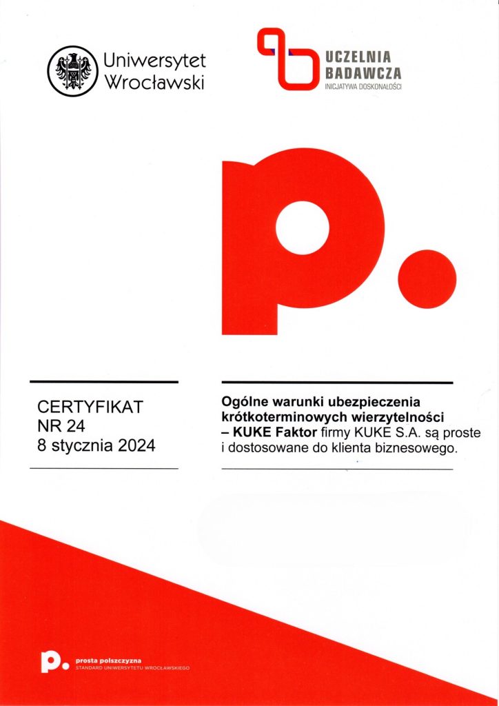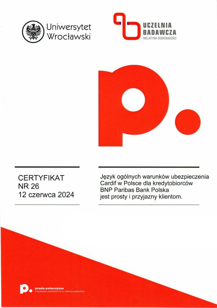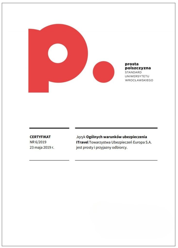 Certyfikat prostej polszczyzny świadczy o tym, że dany dokument został sformułowany w taki sposób, aby być łatwo zrozumiałym dla różnych grup odbiorców, eliminując niepotrzebnie skomplikowane sformułowania czy trudne do zrozumienia terminy. Korzyści z posiadania certyfikatu dokumentu za używanie prostego języka polskiego mogą obejmować poprawę relacji z odbiorcami, zminimalizowanie ryzyka błędów interpretacyjnych, a także zwiększenie ogólnej przejrzystości i akceptowalności dokumentu wśród różnych grup społecznych. Certyfikat taki może także świadczyć o zaangażowaniu organizacji w komunikację opartą na prostym języku, co może wpływać pozytywnie na jej wizerunek. Certyfikat ten może być umieszczony na pierwszej stronie dokumentu lub dostarczony osobno. Napisz do nas: wspolpraca.ppp@uwr.edu.pl